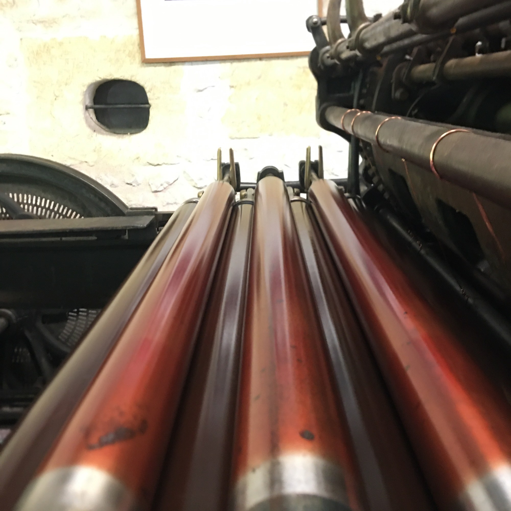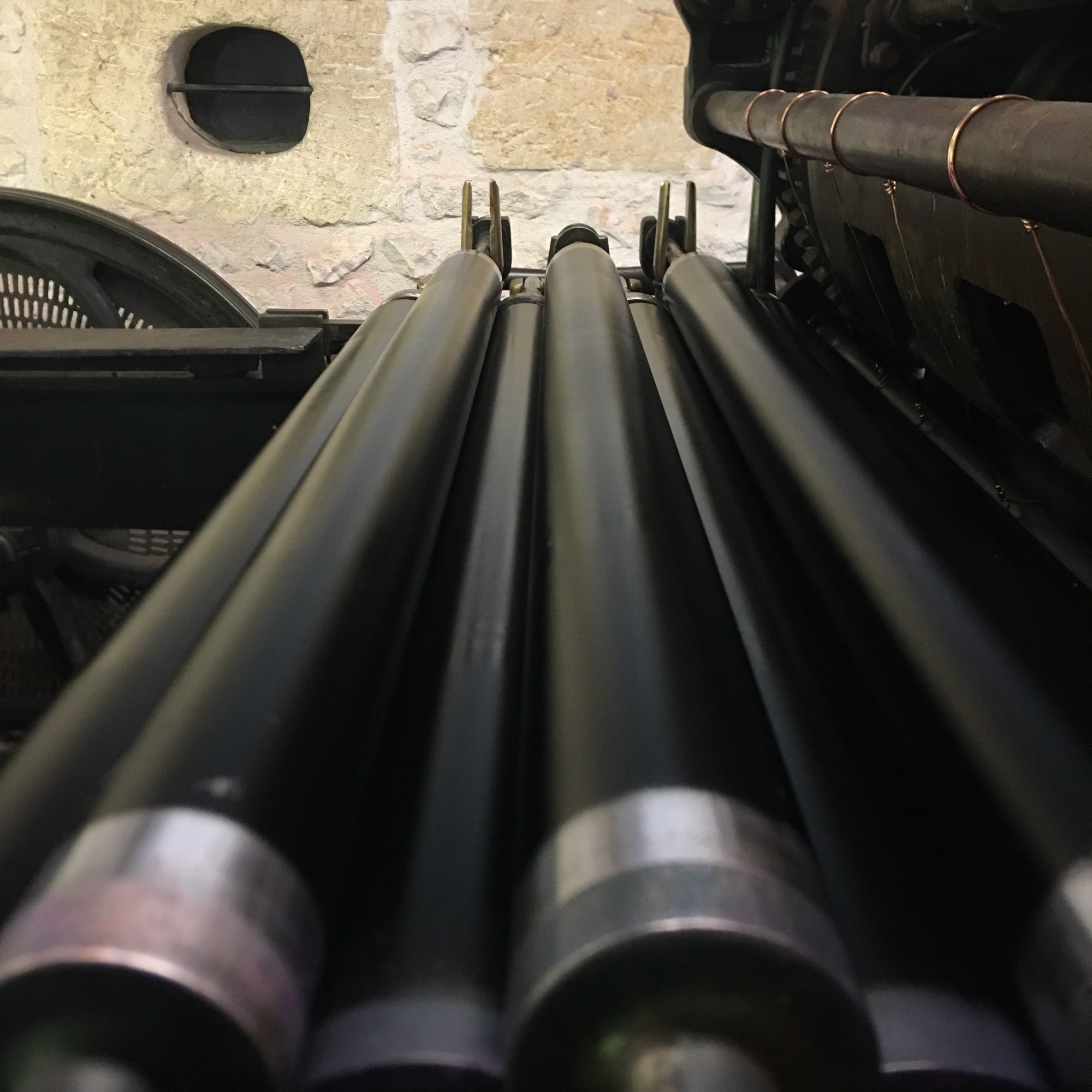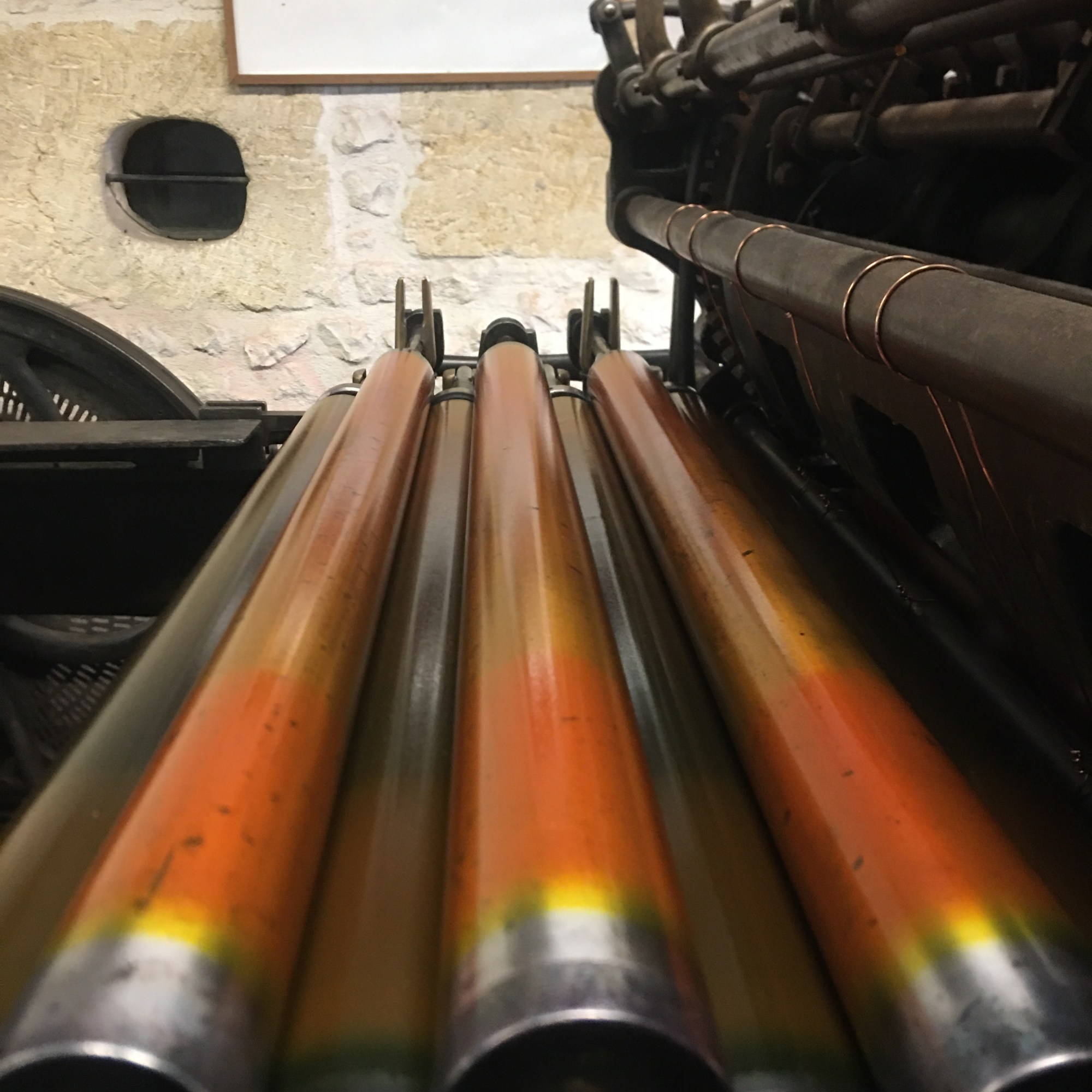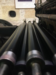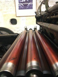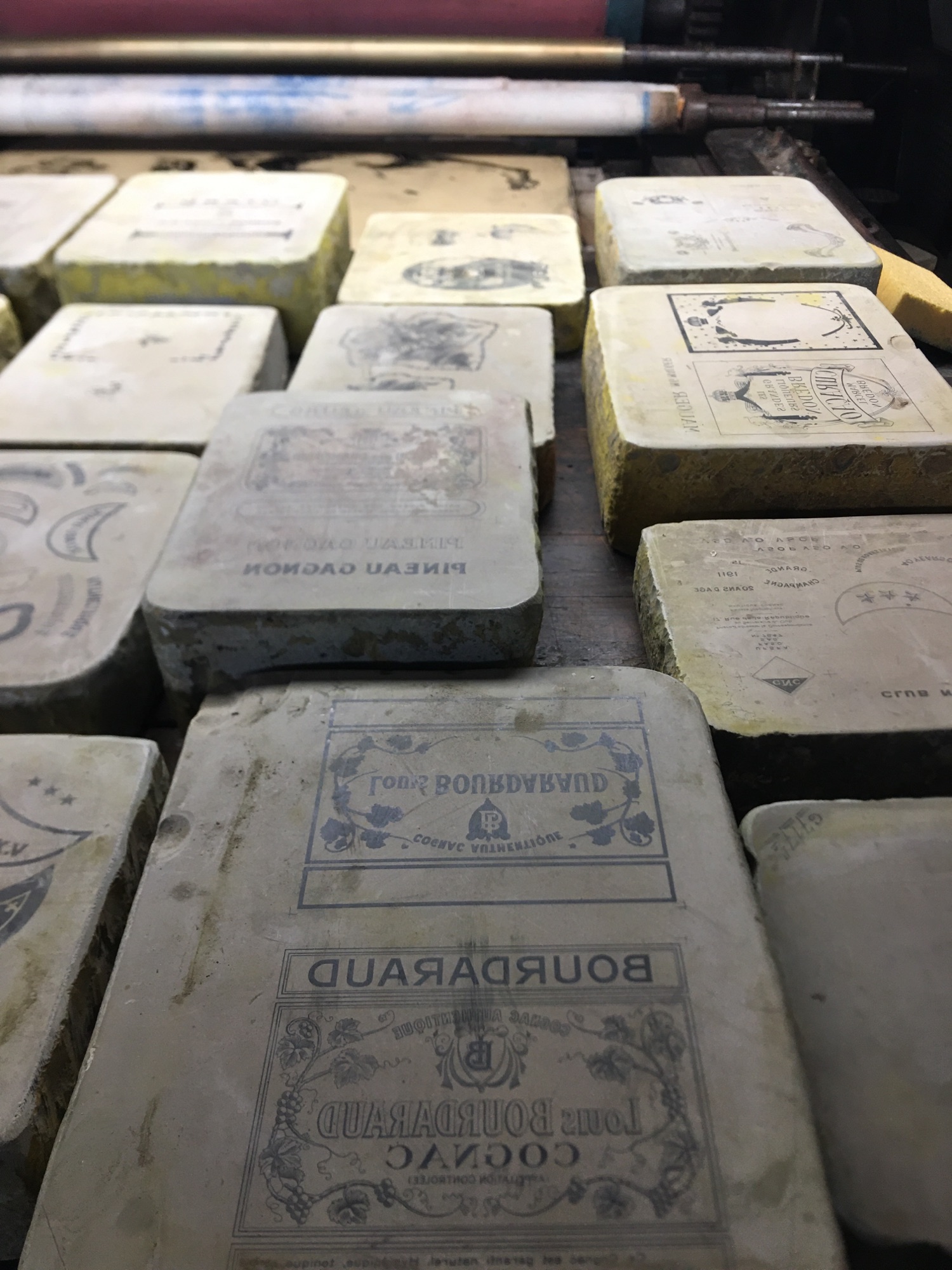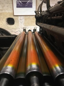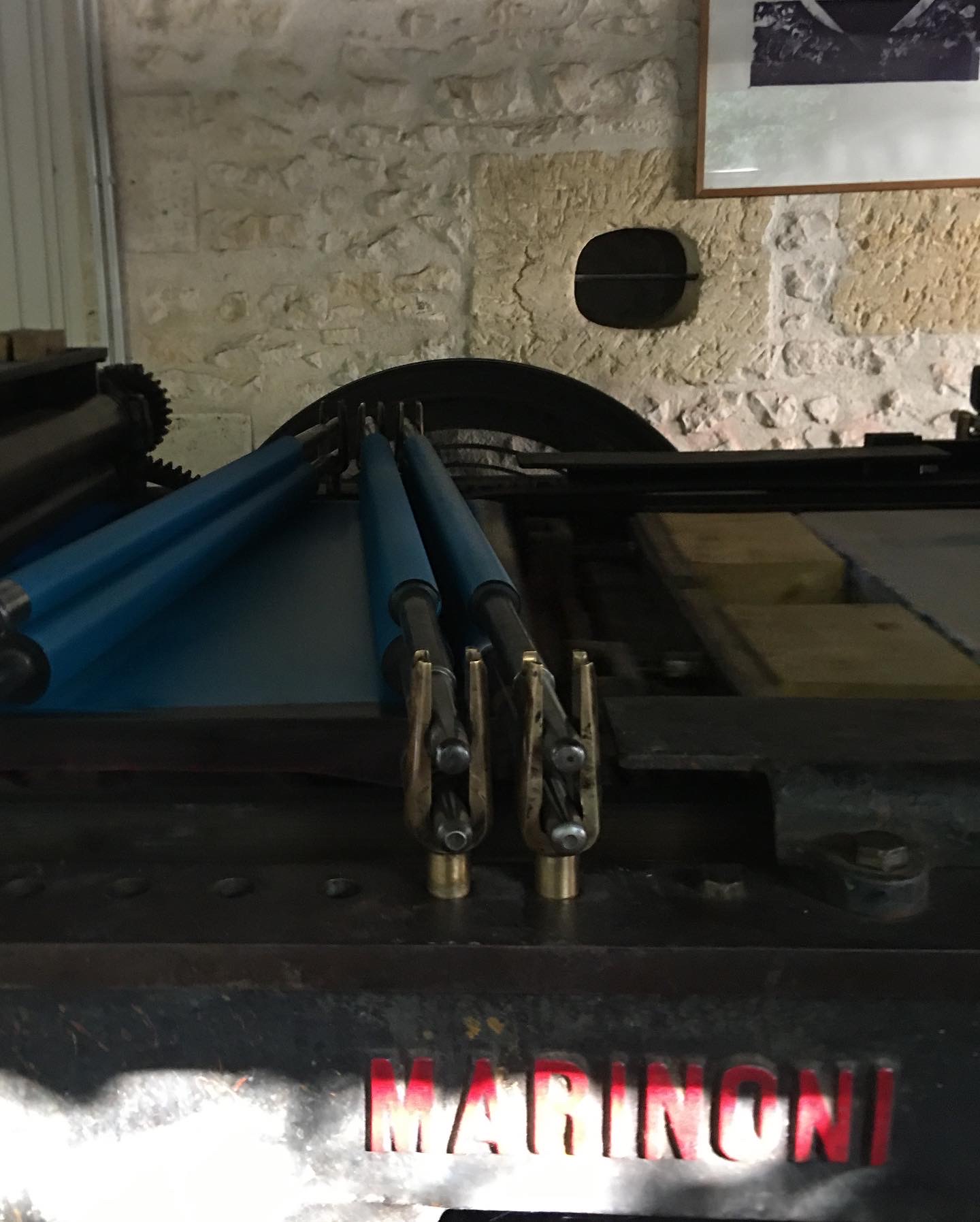 En lithographie de deux presses dont une presse plate Marinoni de format colombier (60×90 cm) et d’une centaine de pierres.