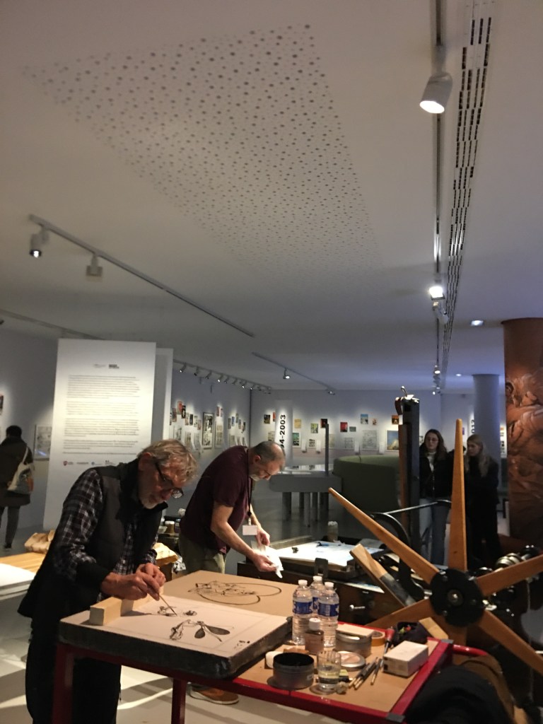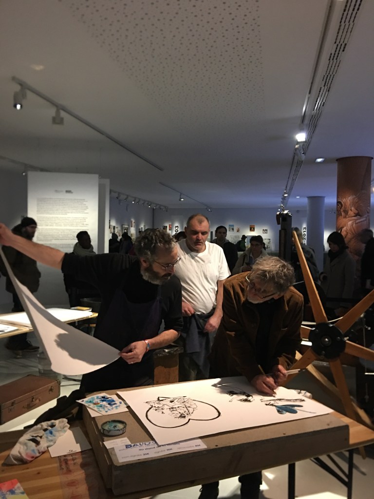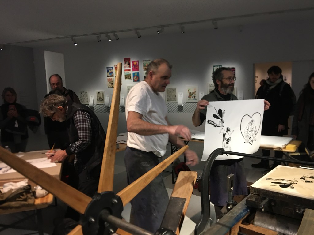 Impression en public des lithographies de Florence Cestac et Edmond Baudoin par Étienne de Champfleury et Laurent Nicolaï.
